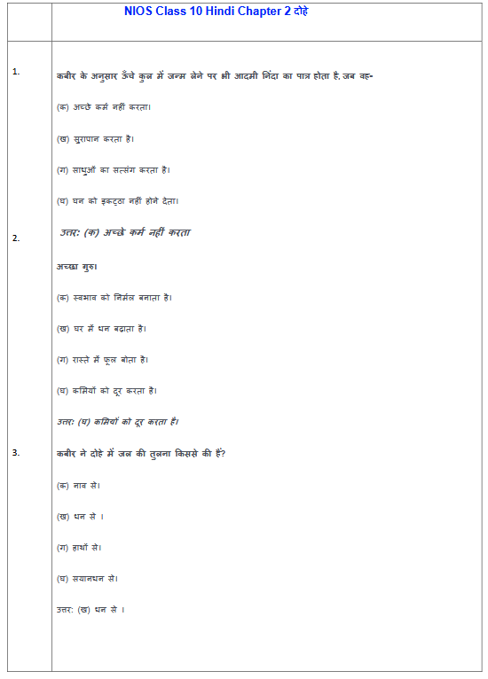 NIOS Class 10 Hindi Chapter 2 Dohe Solutions are listed for each chapter so you can easily browse the individual NIOS Class 10 Hindi Chapter 2 Dohe Notes and choose the one you need. NIOS Class 10 Hindi Chapter 2 Couplets Question Answers. NIOS Study Material for Class 10 Hindi Notes Paper 201.NIOS ,NIOS, Class 10 Hindi Chapter 2 Couplet Solutions