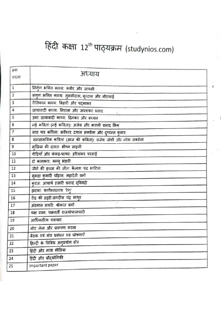 इस पाठ्य क्रम Nios की Book से लिया गया है। इस पाठ्य कम में पंघ खण्ड व गद्य खण्ड के आलावा व्याकरण पर भी ध्यान दिया गया है। ताकि सभी विधार्थी इसे आसानी से समझ सके । Nios में कुल 25अध्याय है।